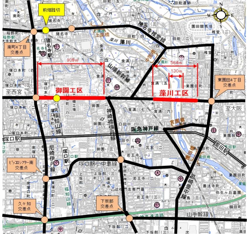 園田西武庫線は、尼崎市の北部を東西に貫く都市計画道路で、つかしんの南側にある産業道路の交差点と御園1丁目間の「御園工区」と、食満から藻川を渡り、園田へと至る「藻川工区」は、長期間にわたって工事が行われていました。